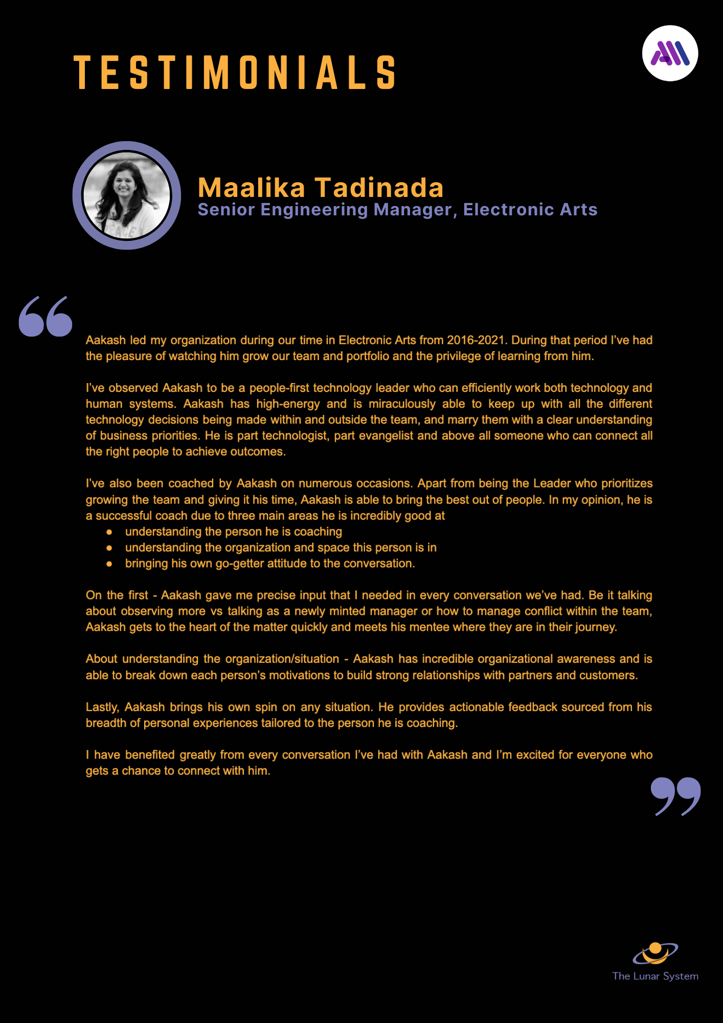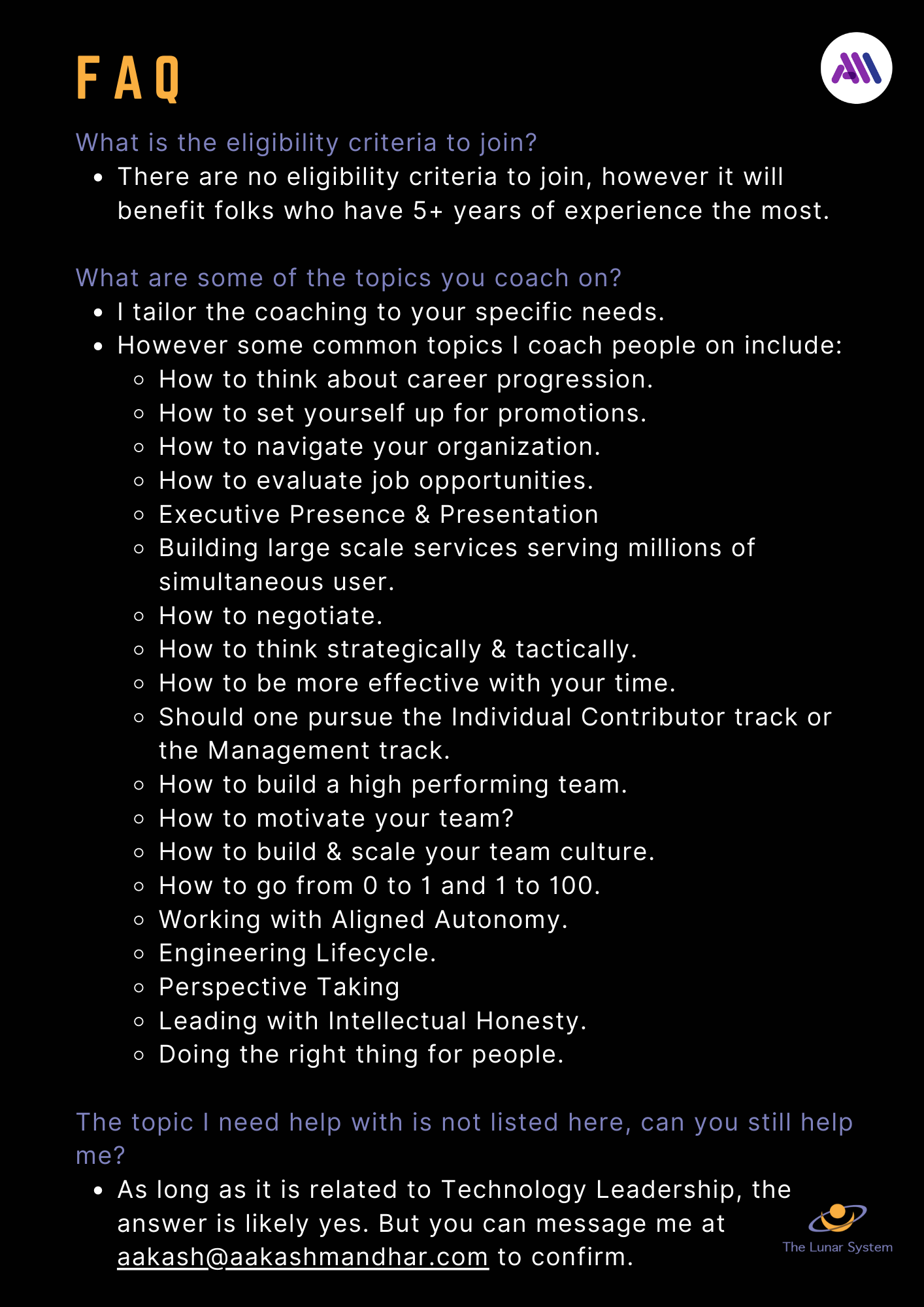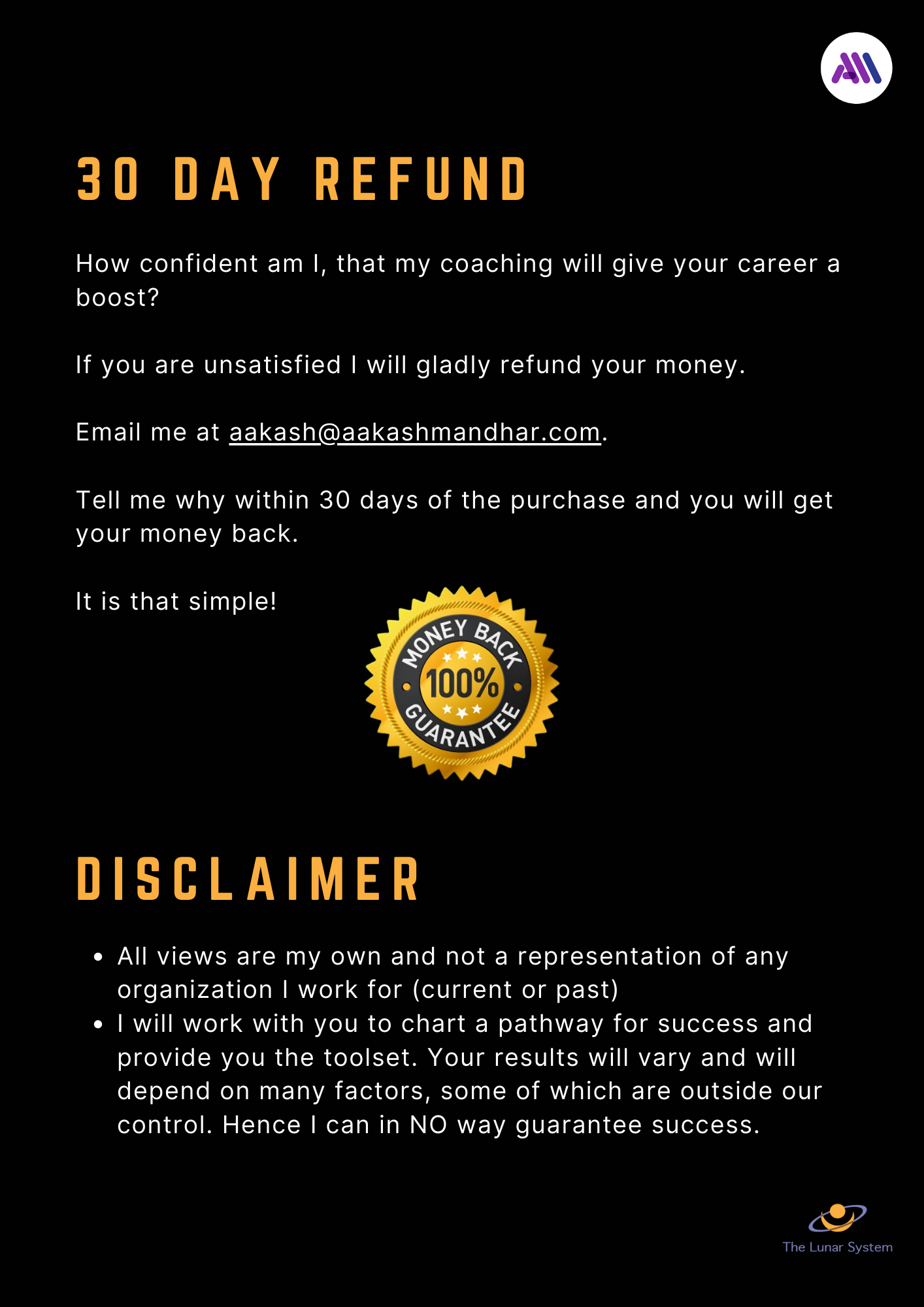 Career AcceleratorAakash Mandhar$1,199 every 3 months1199usdBasic Package➡️ Q&A Email Access ($1,000 value)➡️ 1-Hour Career Strategy Coaching Call ($750 value)$2,499 every 3 months2499usdAdvanced Package➡️ Bi-Weekly 1-Hour Coaching Calls ($3,000 value)$2,999 every 3 months2999usdElite Package➡️ Bi-Weekly 1-Hour Coaching Calls ($3,000 value)➡️ Q&A Email Access ($1,000 value)31,199usdSubscribecareer coaching from Aakash to help you realize your full potential.Add to wishlist New wishlistShare on XShare on Facebook Copy linkCopy product URL